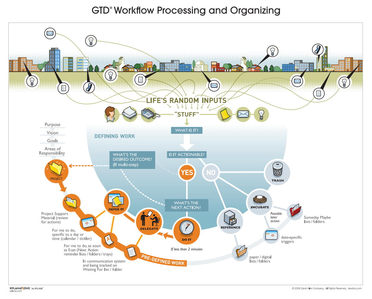 GTD 的方法非常简单,下面这张图就是 GTD 的基本思路: